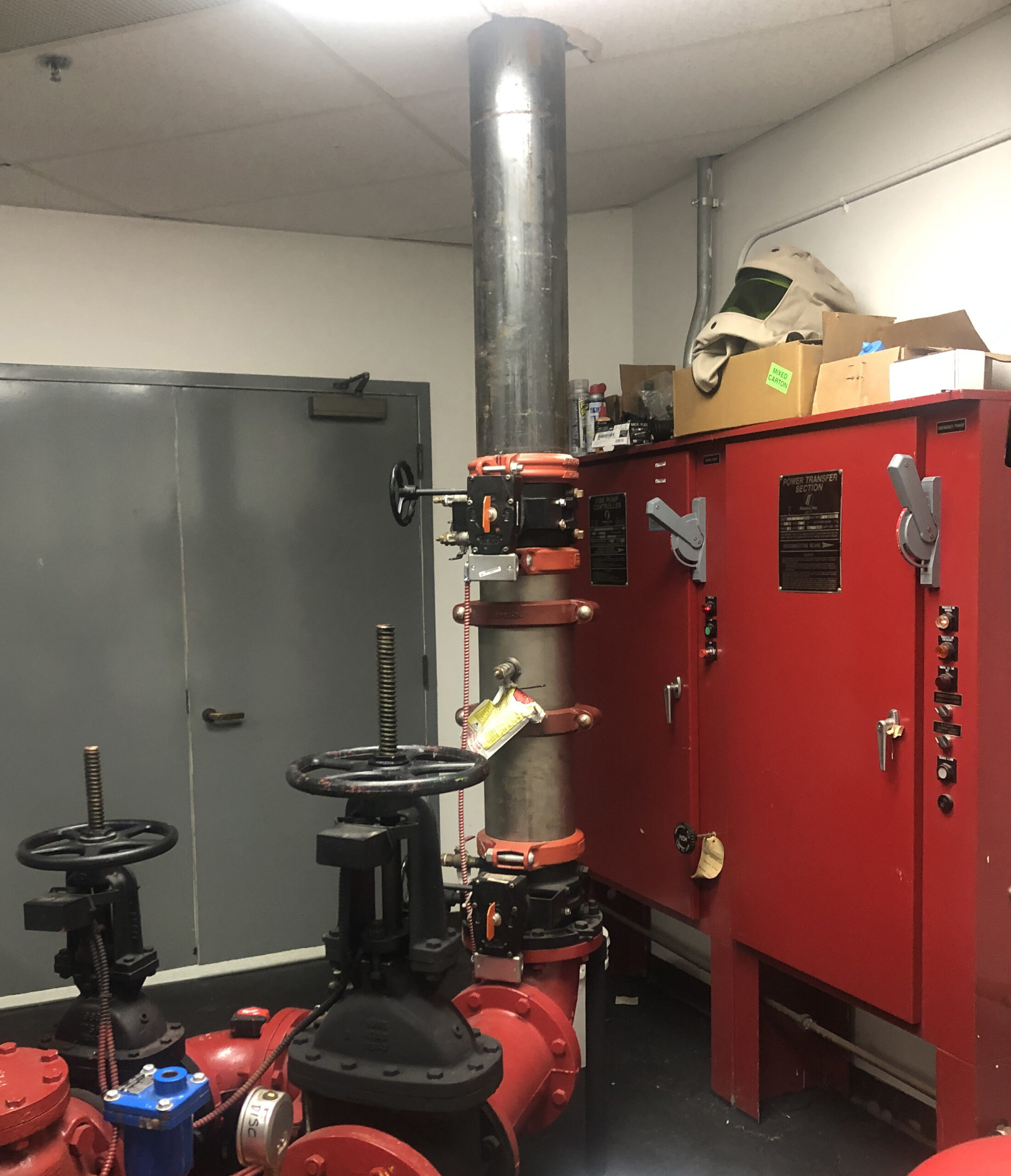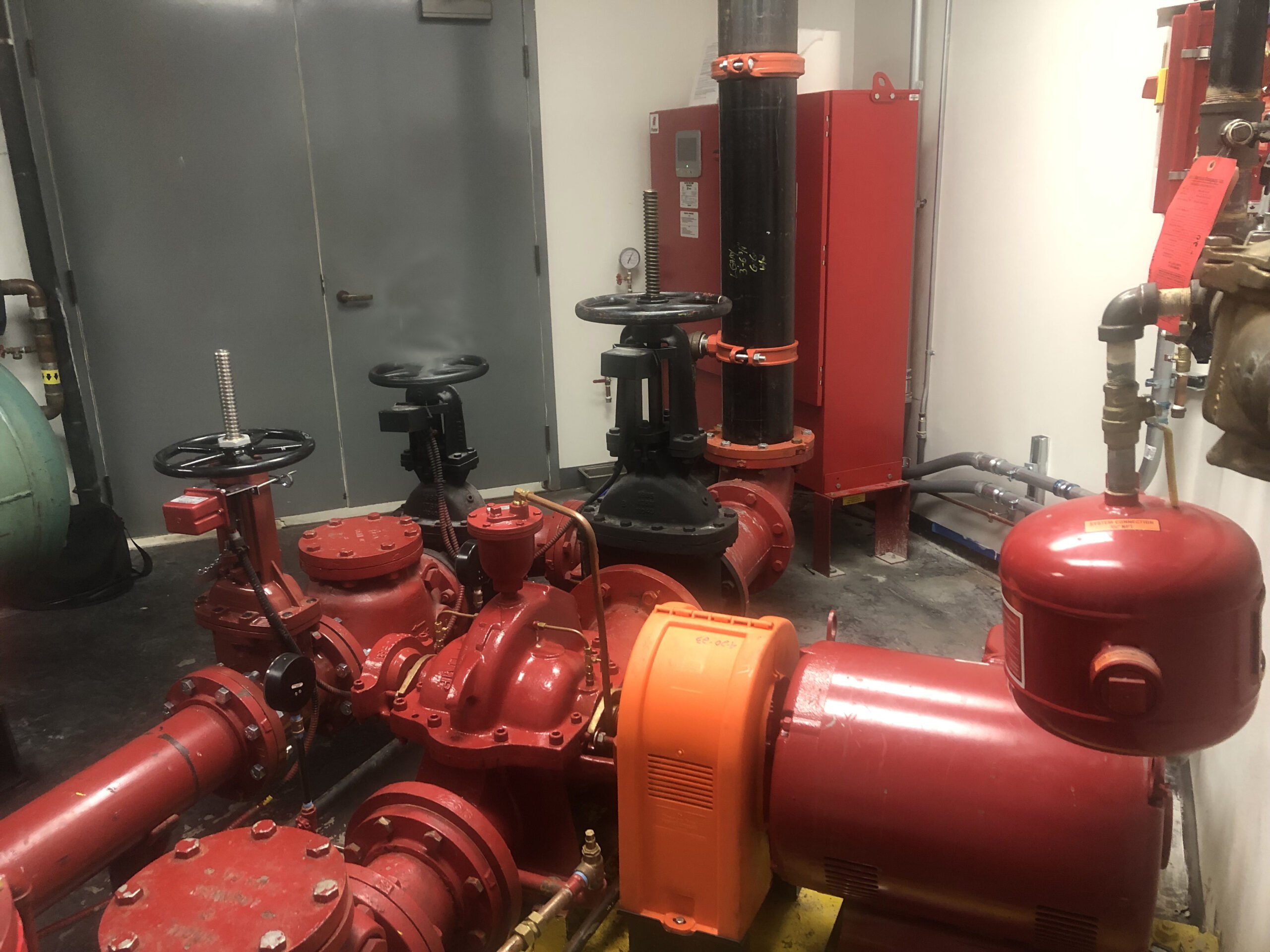 In addition, the main fire pump controller was not functioning properly, and replacement parts were no longer available in order to repair it. The jockey pump and jockey pump controller were original to the  38 year-old building and therefore it was decided to replace these two pieces of equipment as well. Due to newer NFPA code regulations, to install the new fire pump main controller it would have to be moved to a new location further from the fire pump piping. To accomplish this, a double door in the room had to be moved to allow more wall space for the new main fire pump controller.